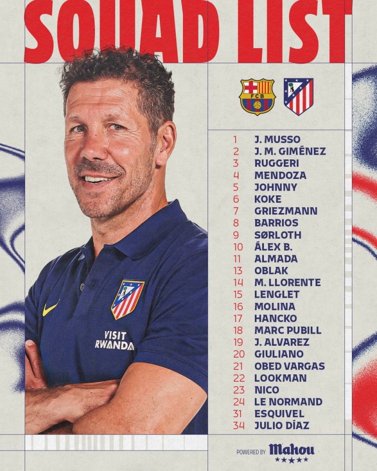前锋:7-格列兹曼、9-瑟尔洛特、11-阿尔马达、19-阿尔瓦雷斯、20-朱利亚诺·西蒙尼、22-卢克曼、23-冈萨雷斯、34-胡里奥·迪亚斯