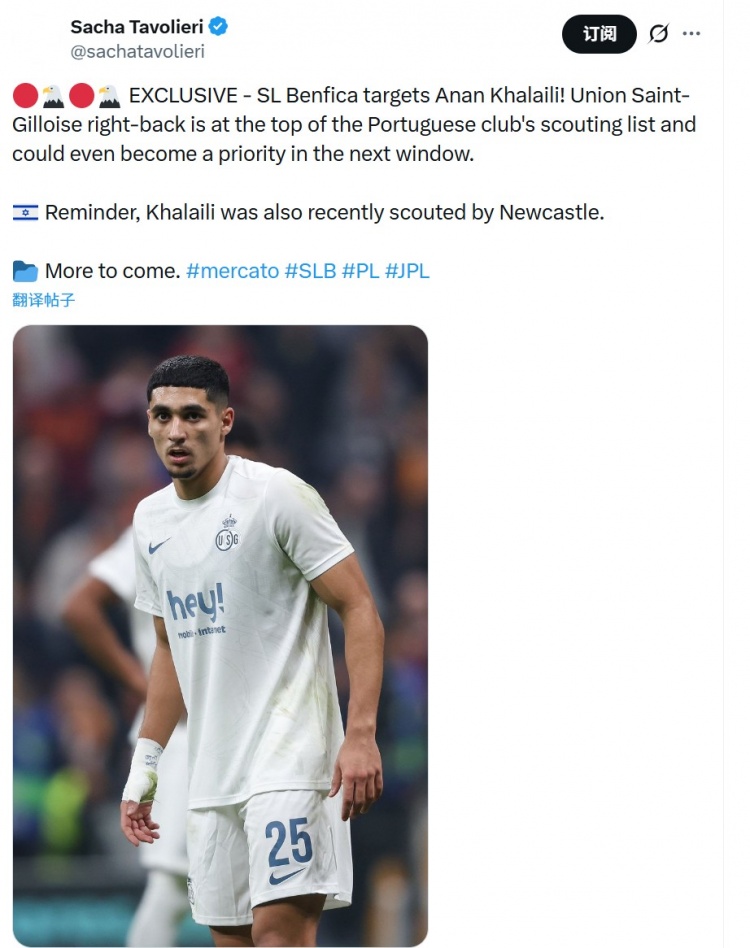 Sacha Tavolieri透露,本菲卡将以色列边卫哈莱利视为首要考察目标,可能在今夏优先运作他的转会,纽卡球探近期也曾考察过卡莱利的表现。